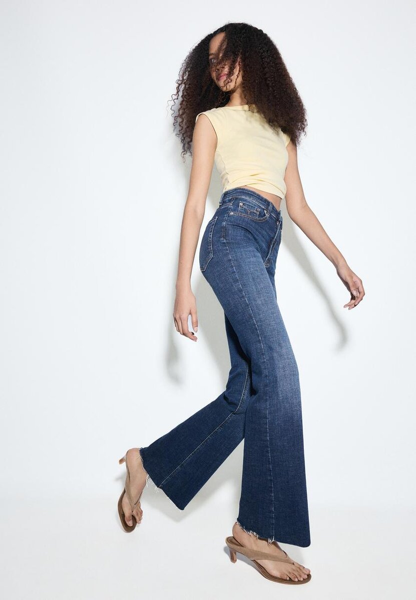 Jeans a vita alta a cinque tasche con passanti per cintura. Caratterizzati da orli a zampa d’elefante con dettagli sfrangiati e spacco interno laterale. Chiusura con patta e cerniera e bottone metallico in alto. Disponibili in vari colori.