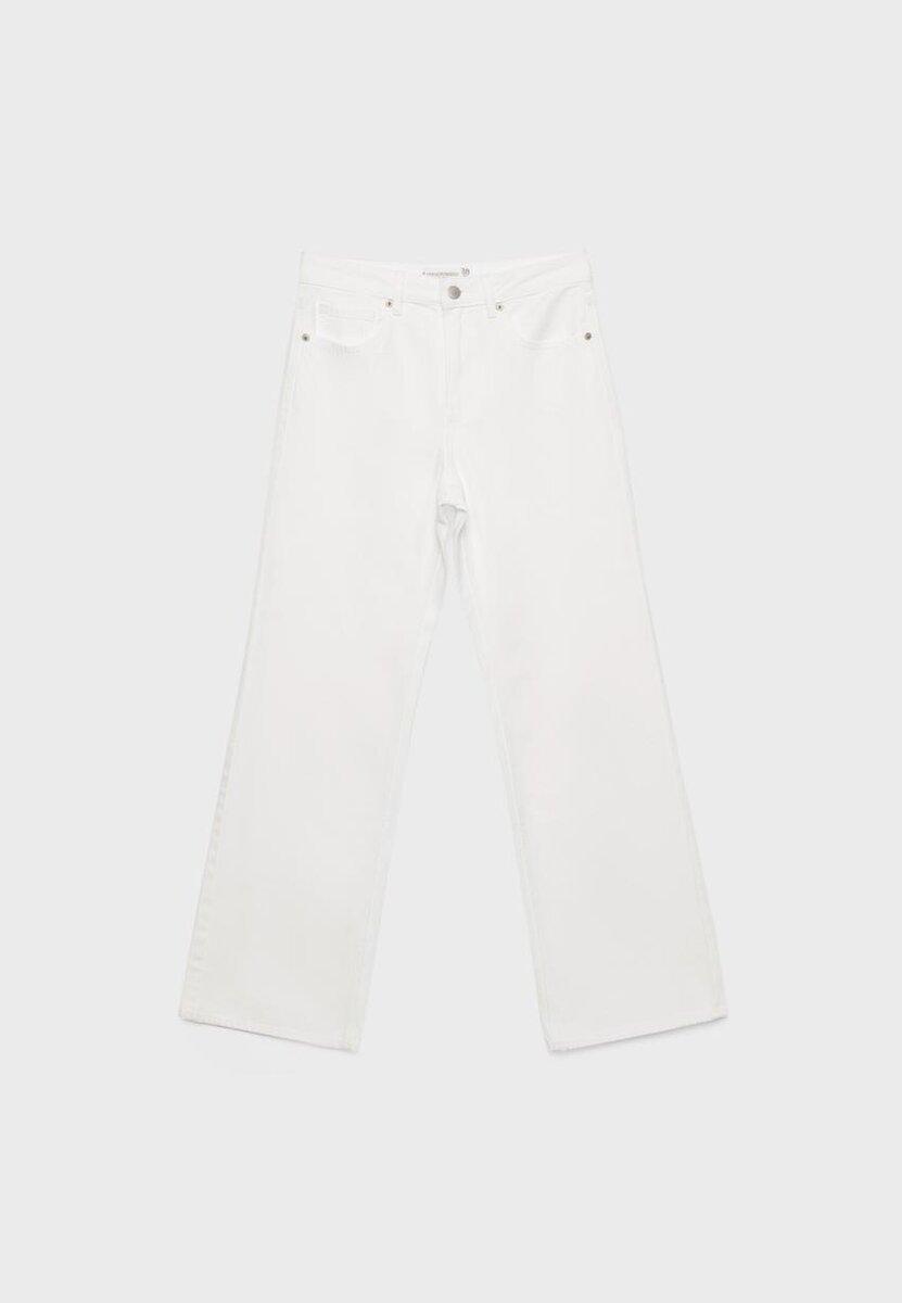 Jeans a vita alta a gamba dritta e larga con tasche anteriori. Tasche applicate sul retro. Cintura con passanti. Gamba dritta e Wide Leg. Chiusura frontale con zip e bottone in metallo. Disponibili in vari colori.