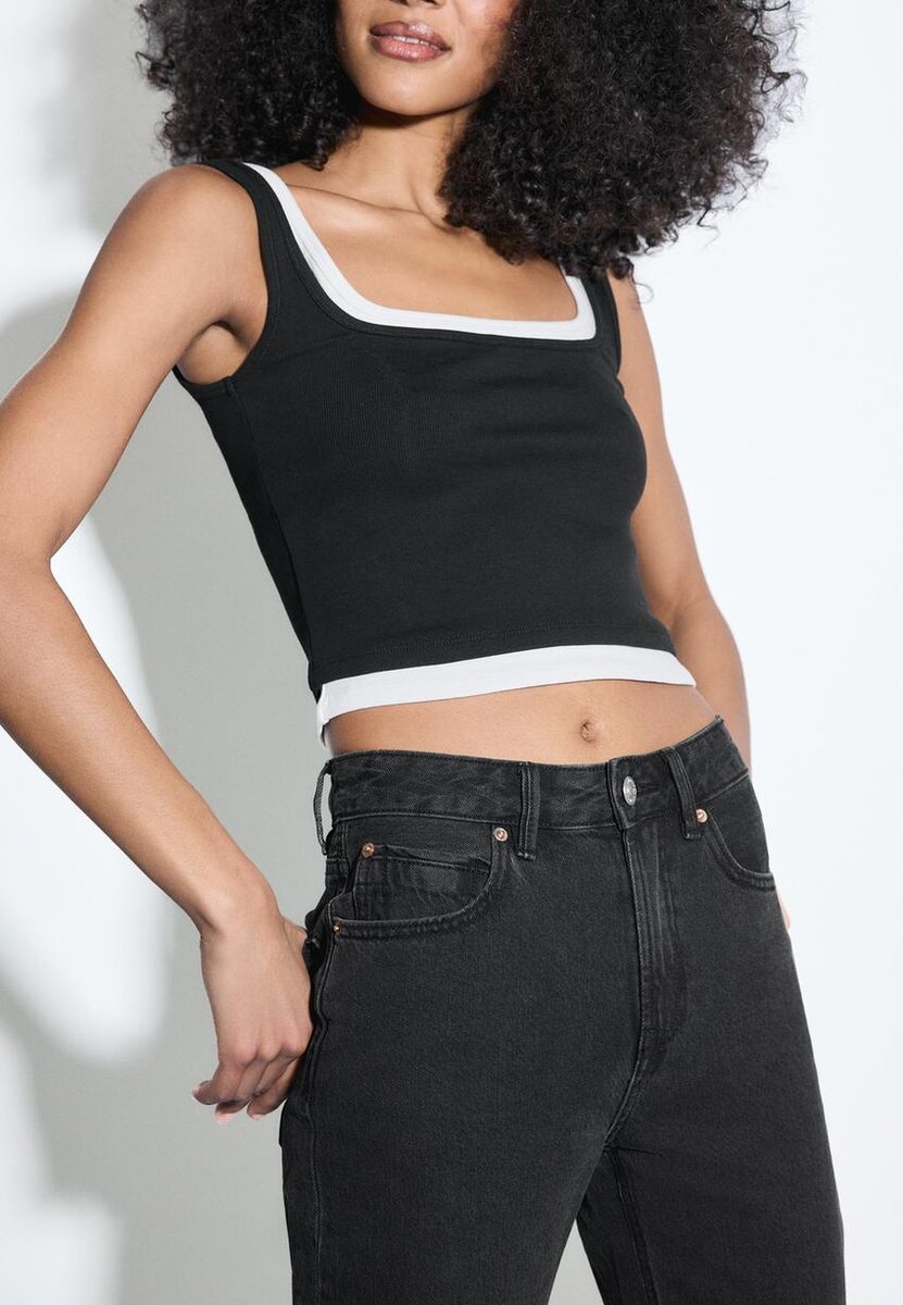 Jeans a gamba dritta a vita media con design a cinque tasche. Chiusura con zip e bottone in metallo. Disponibili in vari colori. Rise: Vita regolare fino all’ombelico