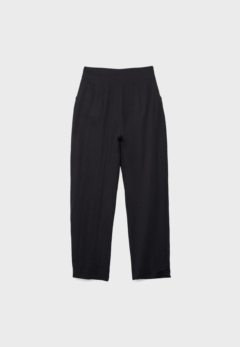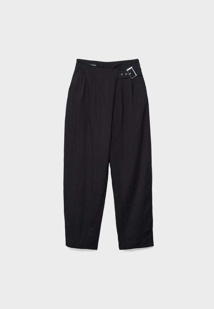 Pantaloni fluidi a vita alta con tasche laterali. Caratterizzati da un dettaglio con fibbia in metallo sul davanti e dal design a gamba fluida con pinces sul davanti. Chiusura con zip laterale invisibile.