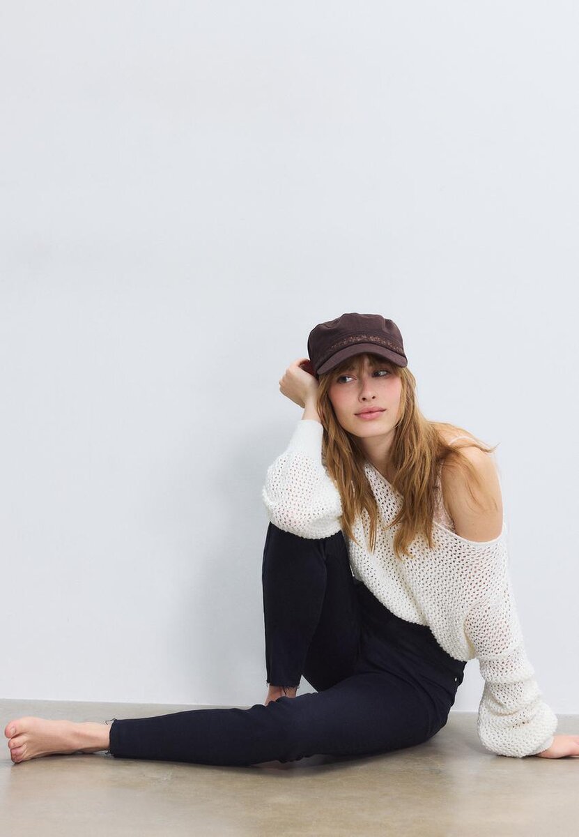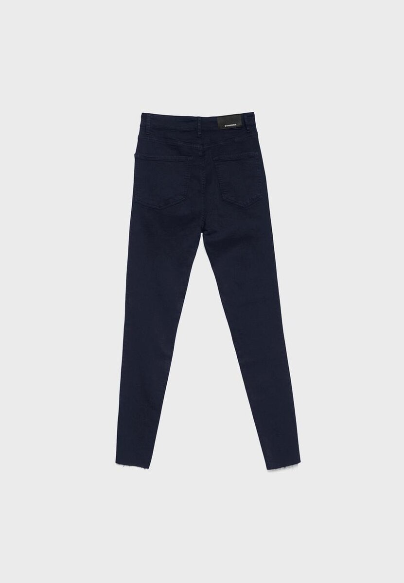 Pantaloni aderenti a vita alta con cinque tasche. Chiusura con zip e bottoni. Disponibili in diversi colori.