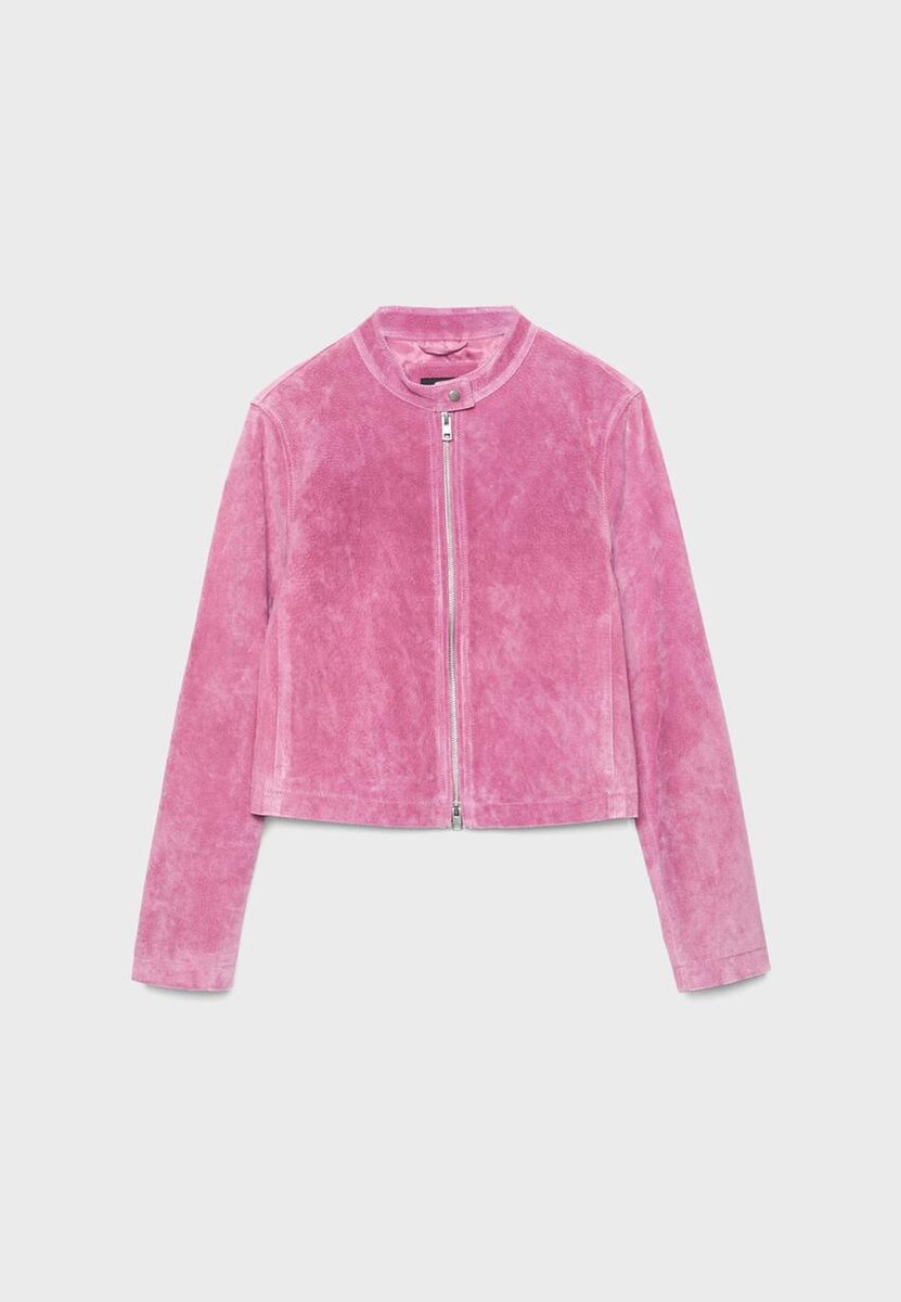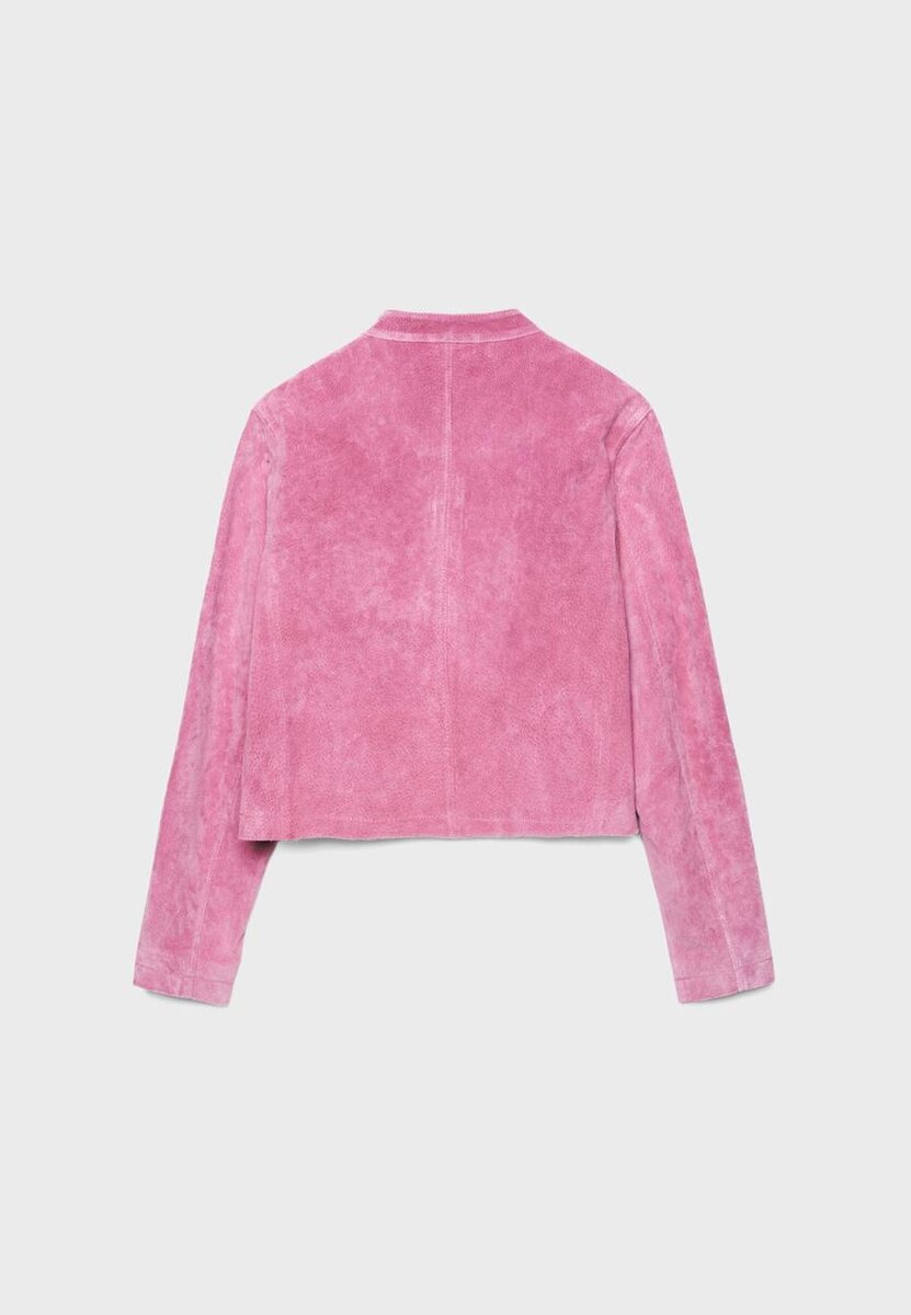 Giacca corta realizzata con tessuto principale in pelle di maiale e fodera in poliestere. Caratterizzata da collo alto con bottone e maniche lunghe. Tasche laterali. Chiusura frontale con zip a doppio cursore.