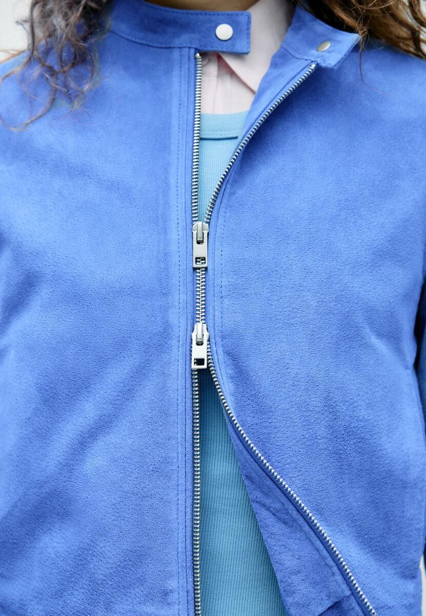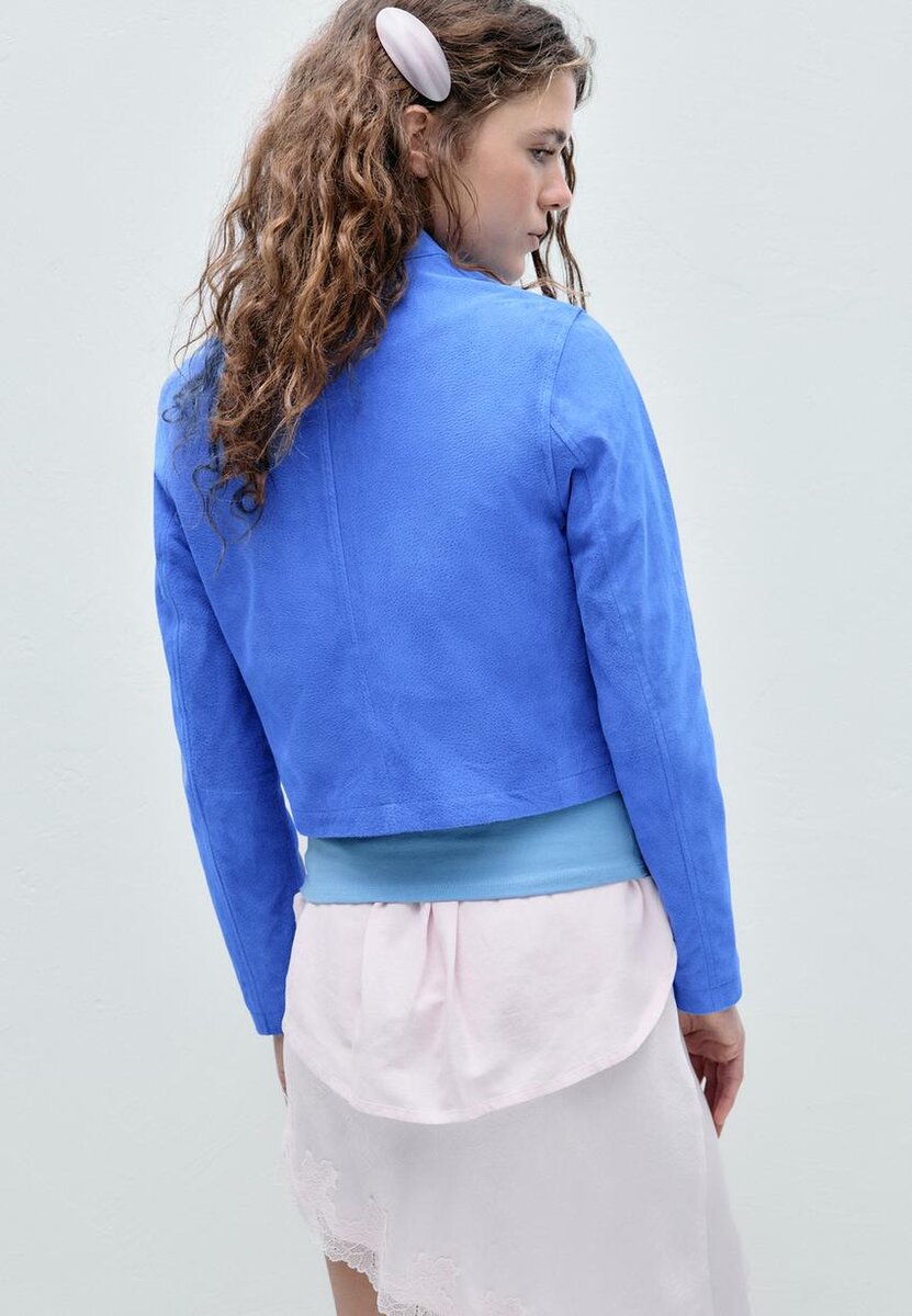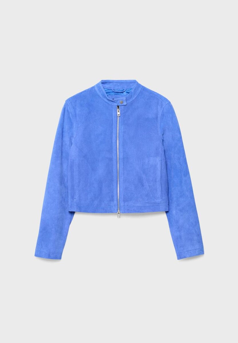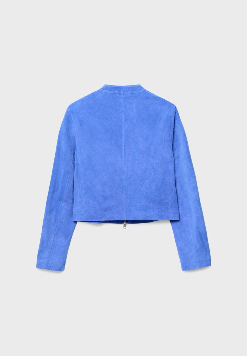 Giacca corta realizzata con tessuto principale in pelle di maiale e fodera in poliestere. Caratterizzata da collo alto con bottone e maniche lunghe. Tasche laterali. Chiusura frontale con zip a doppio cursore.