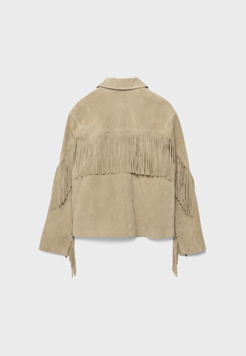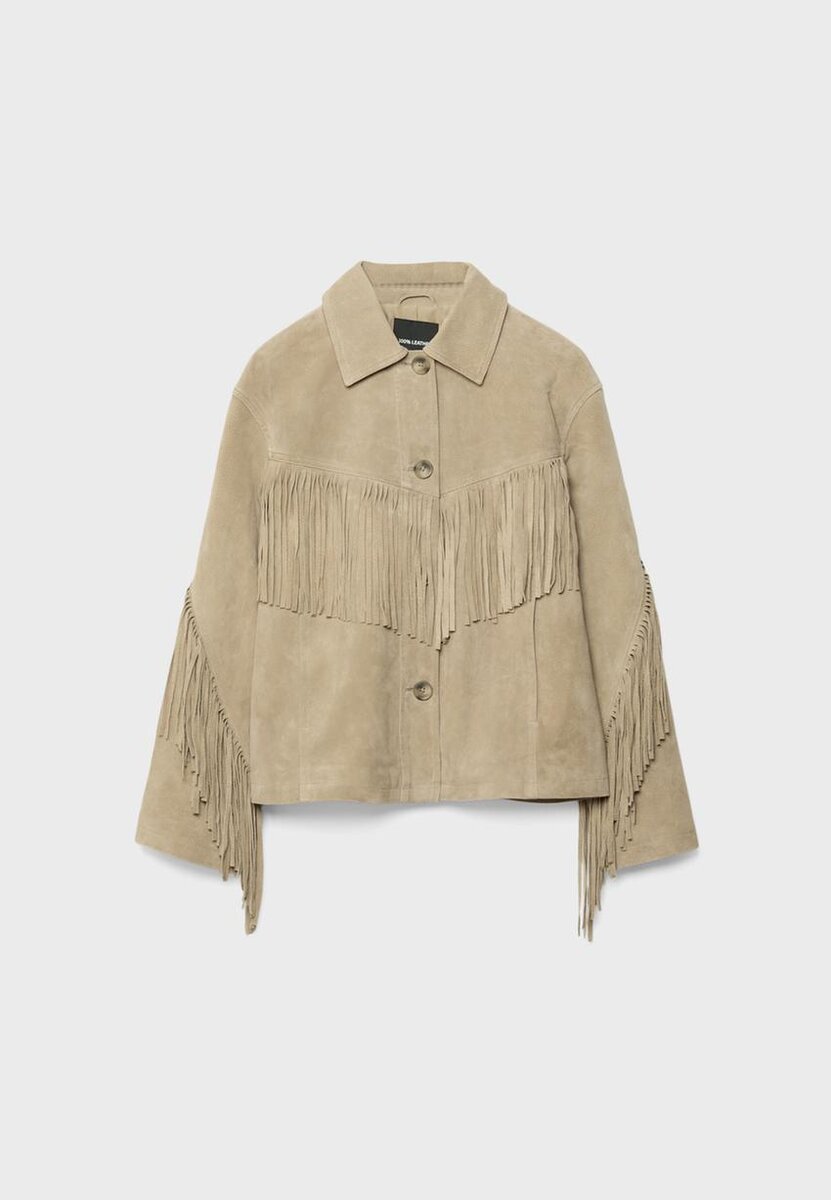 Giacca realizzata con tessuto principale in pelle e fodera in poliestere. Colletto a revers e maniche lunghe. Dettagli con frange sul davanti e sulle maniche. Chiusura frontale con bottoni.