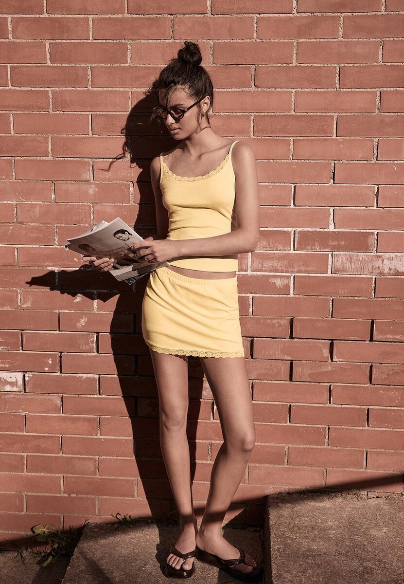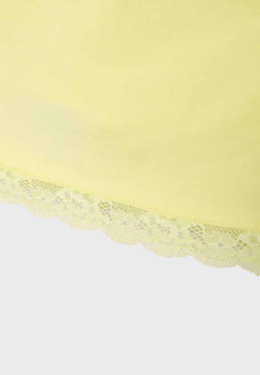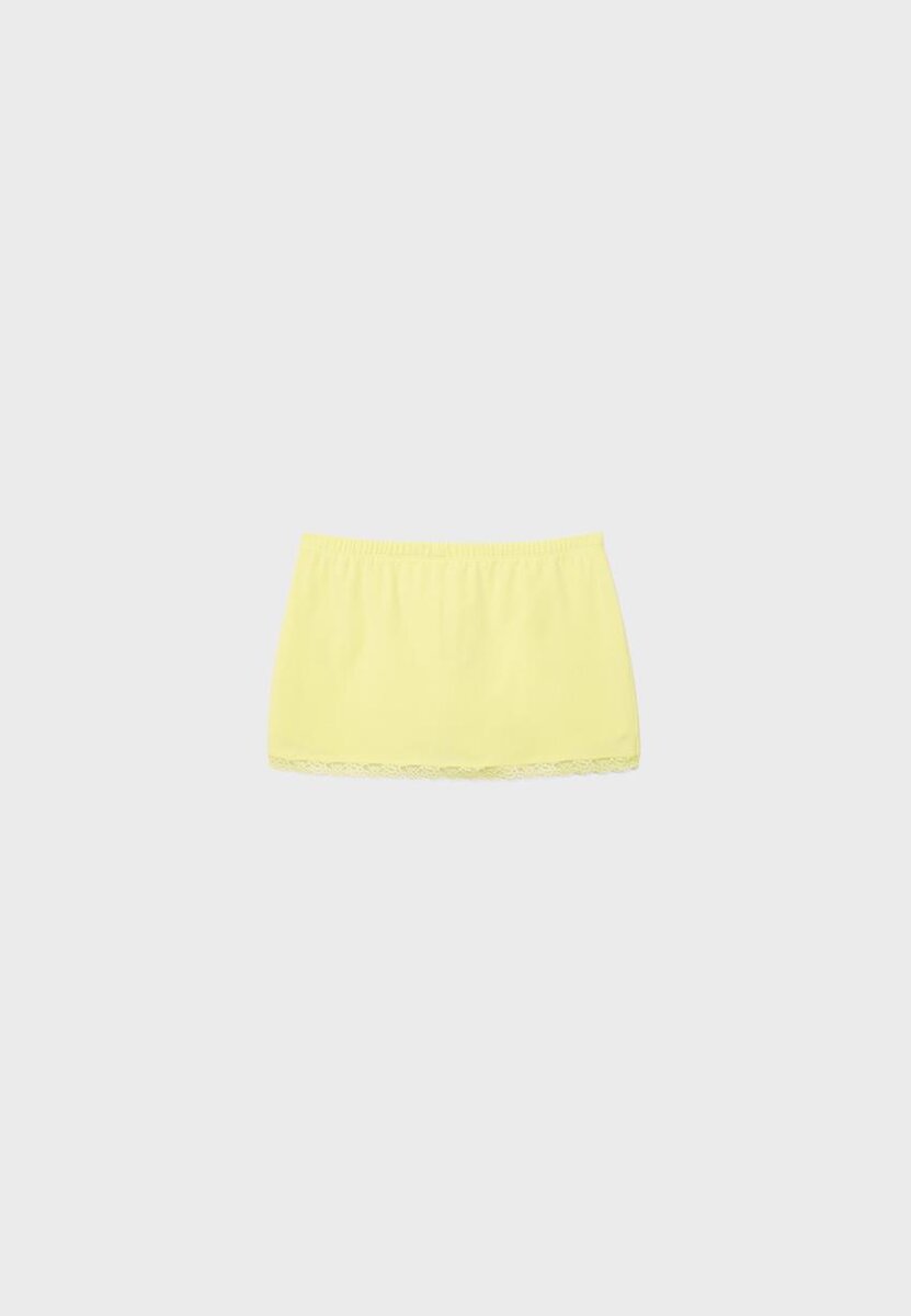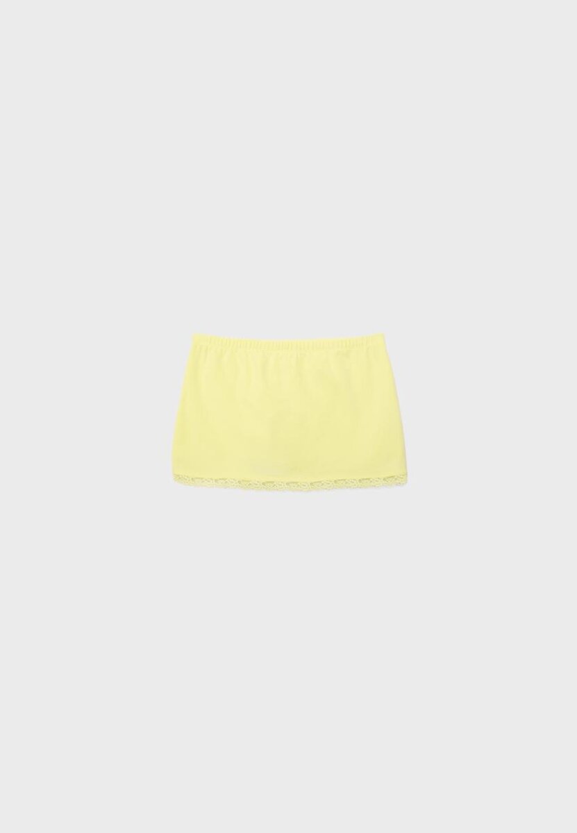 Skort corto con elastico in vita e orlo rifinito in pizzo. Pantaloncini interni abbinati.