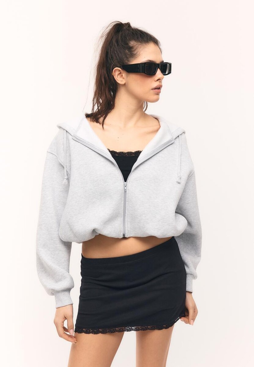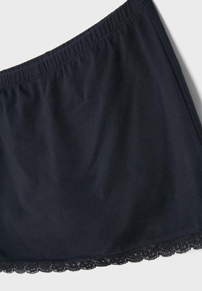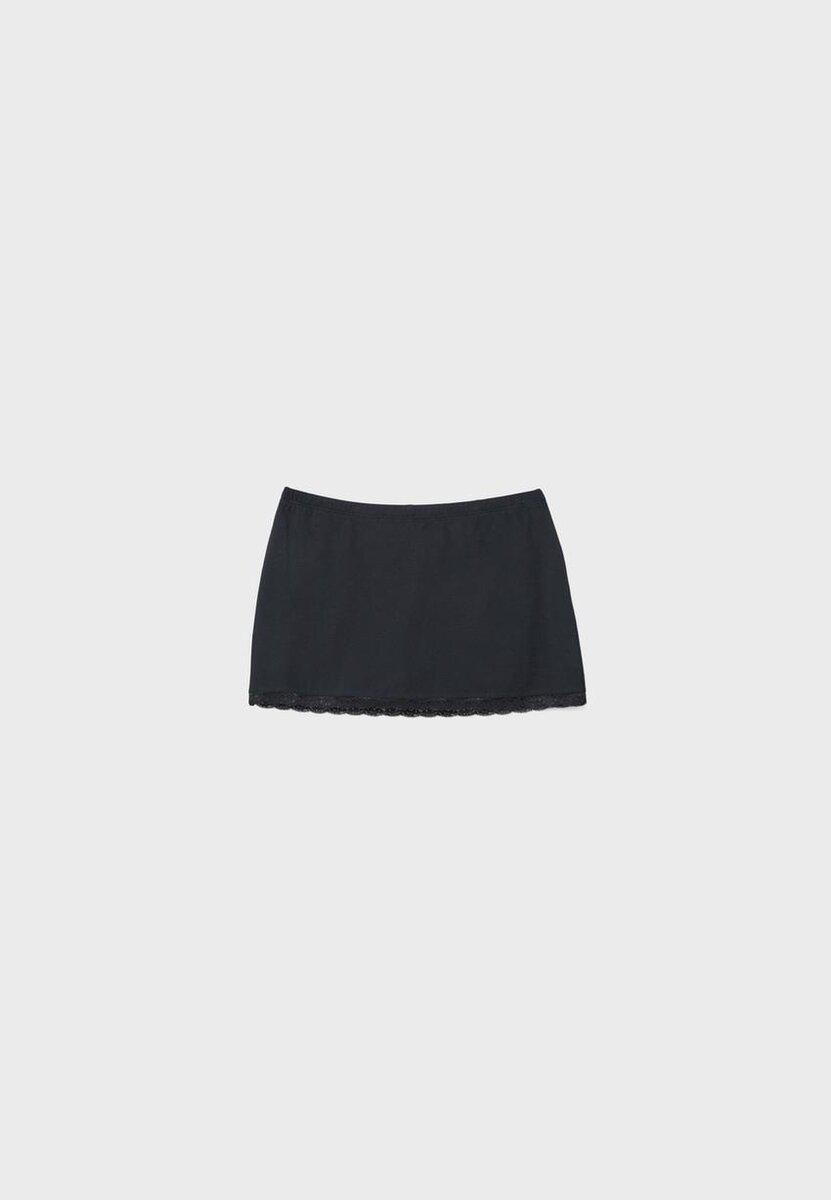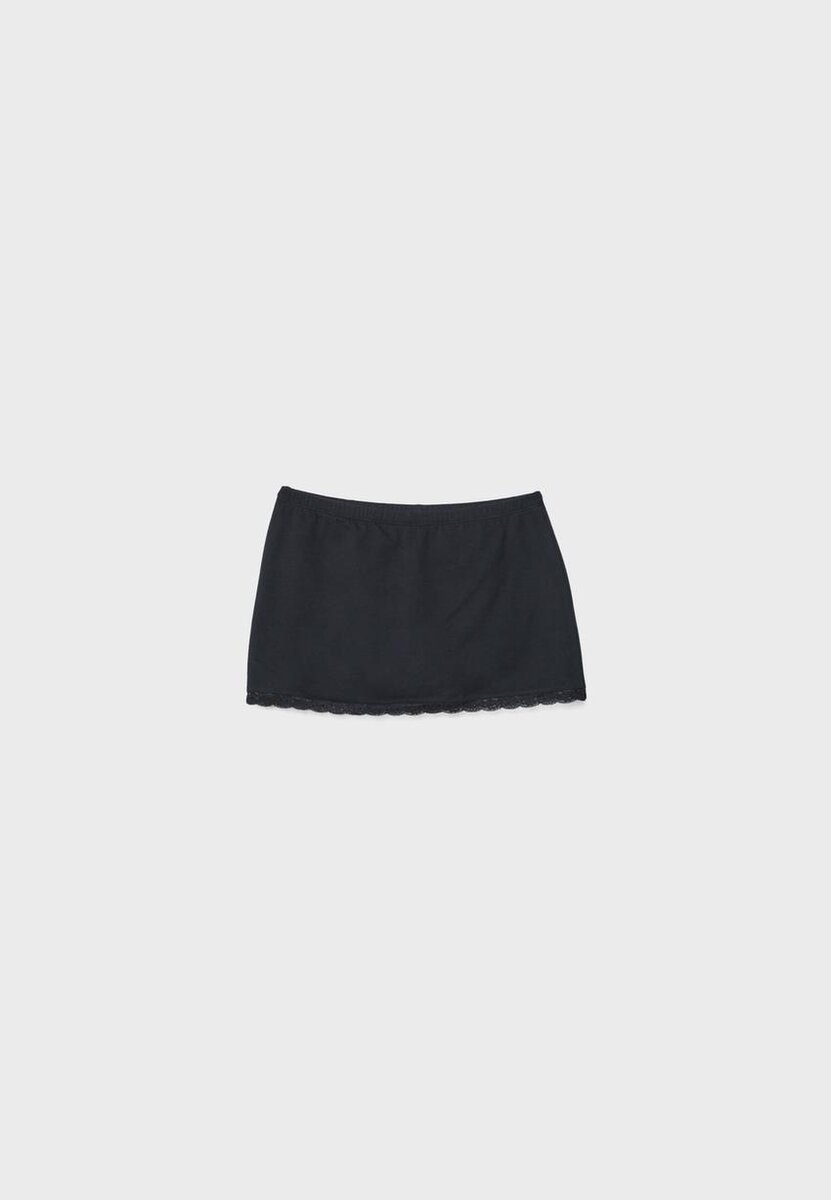 Skort corto con vita elasticizzata e orlo con bordi in pizzo. Pantaloncini interni abbinati. Disponibile in vari colori.
