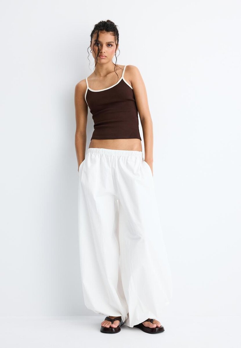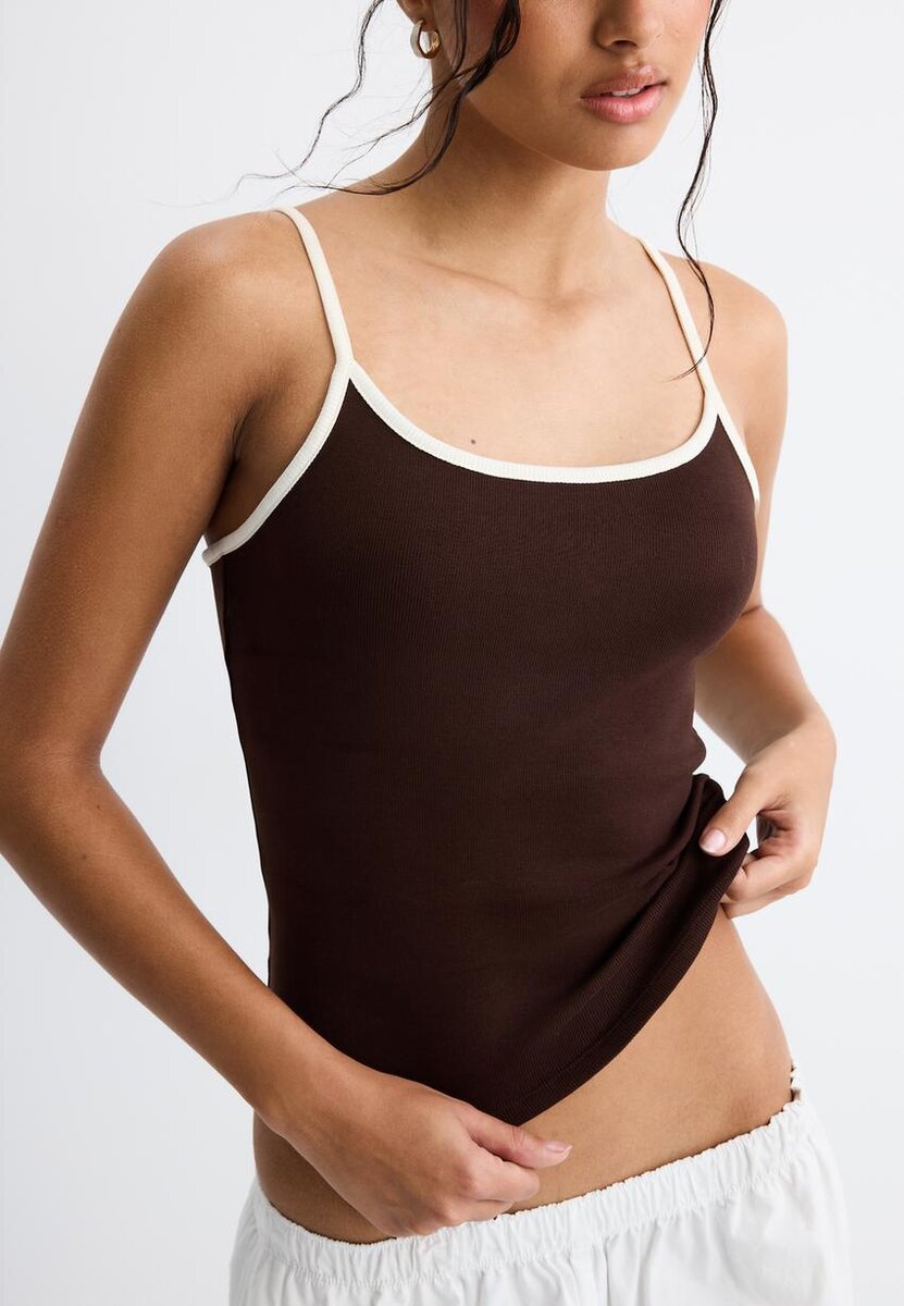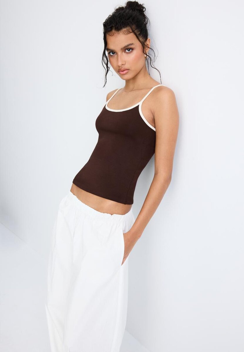 Top in misto cotone. Taglio aderente. Scollo rotondo e spalline. Dettagli a trama a costine. Disponibile in vari colori.