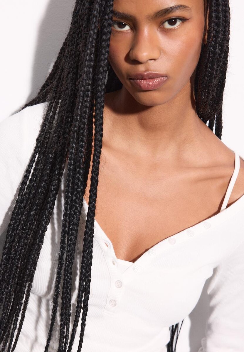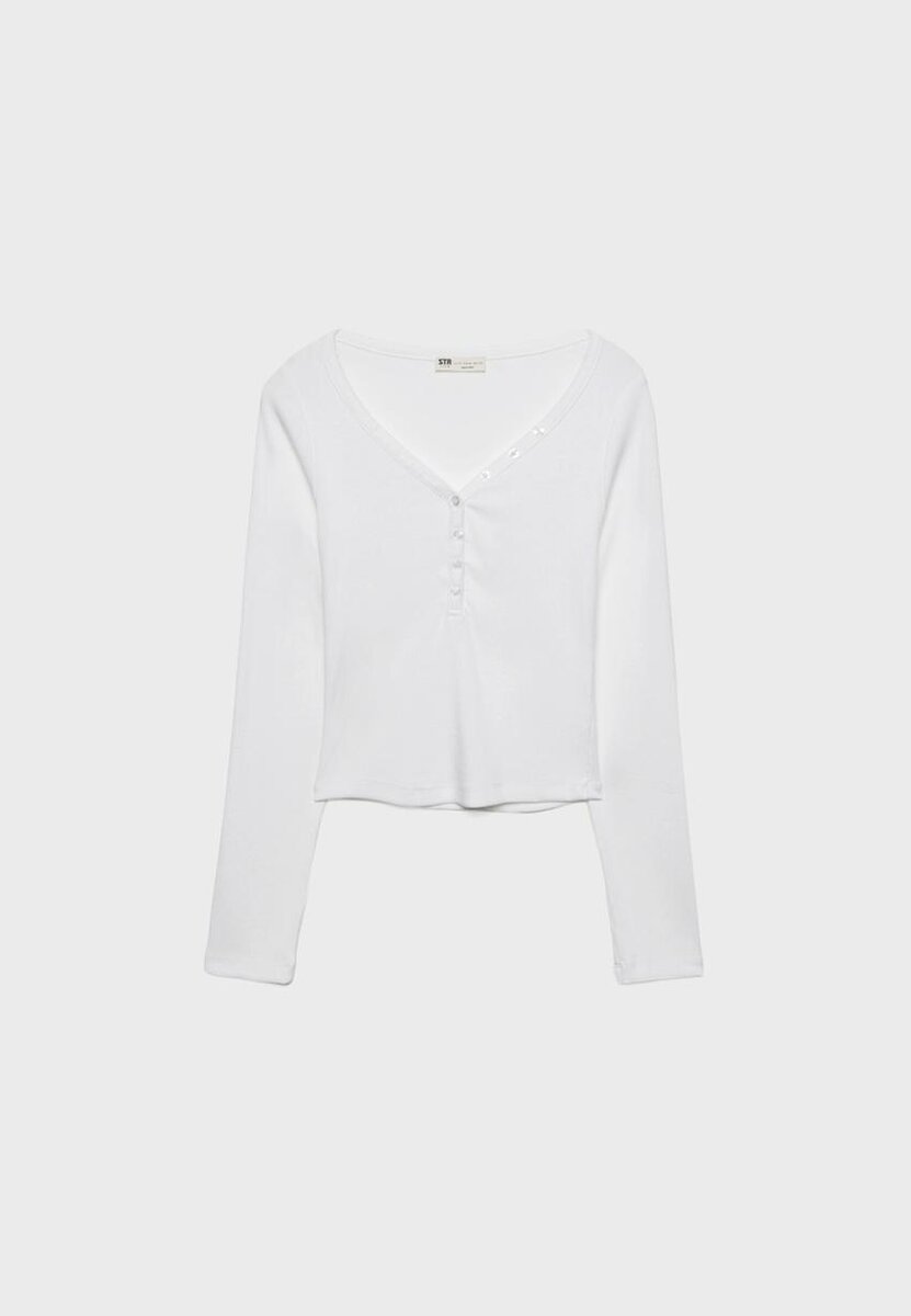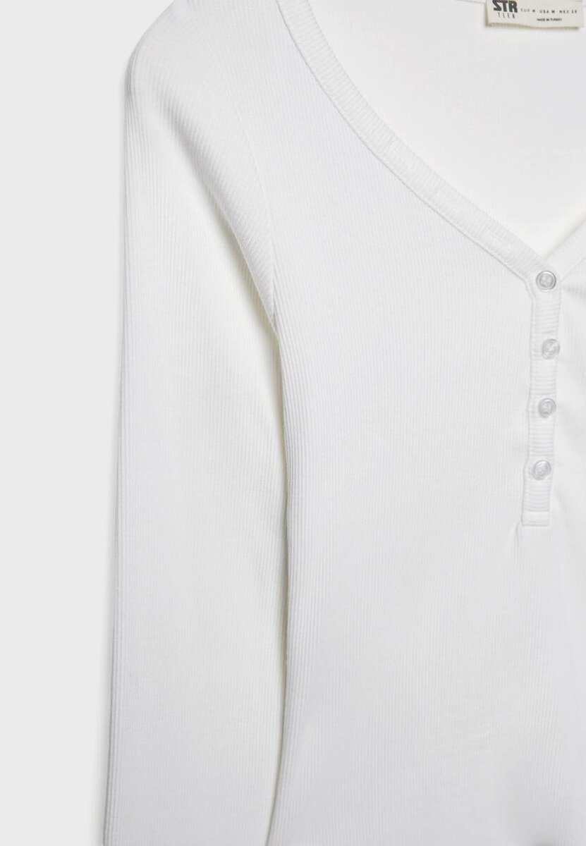 T-shirt aderente con scollo a V abbottonato e maniche lunghe. Disponibile in diversi colori.