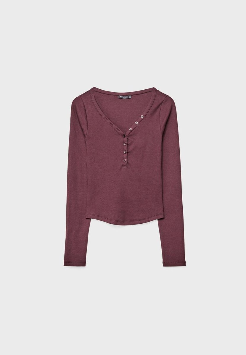 T-shirt aderente con scollo a V abbottonato e maniche lunghe. Disponibile in diversi colori.