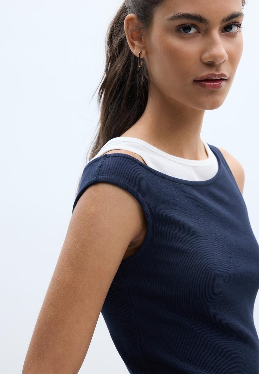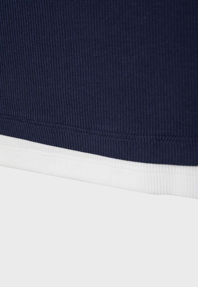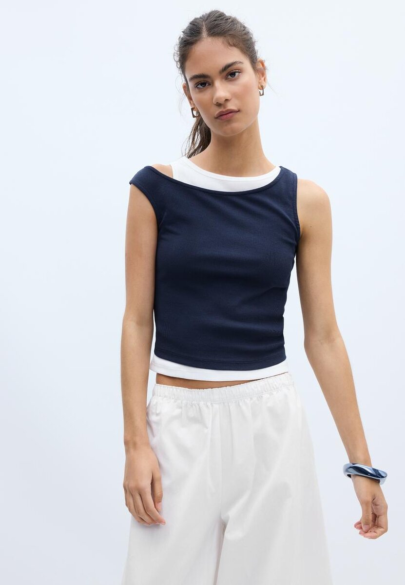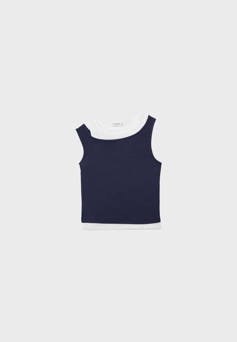 T-shirt girocollo con spalline. Caratterizzata da un design a doppio strato a contrasto. Disponibile in una vasta gamma di colori.