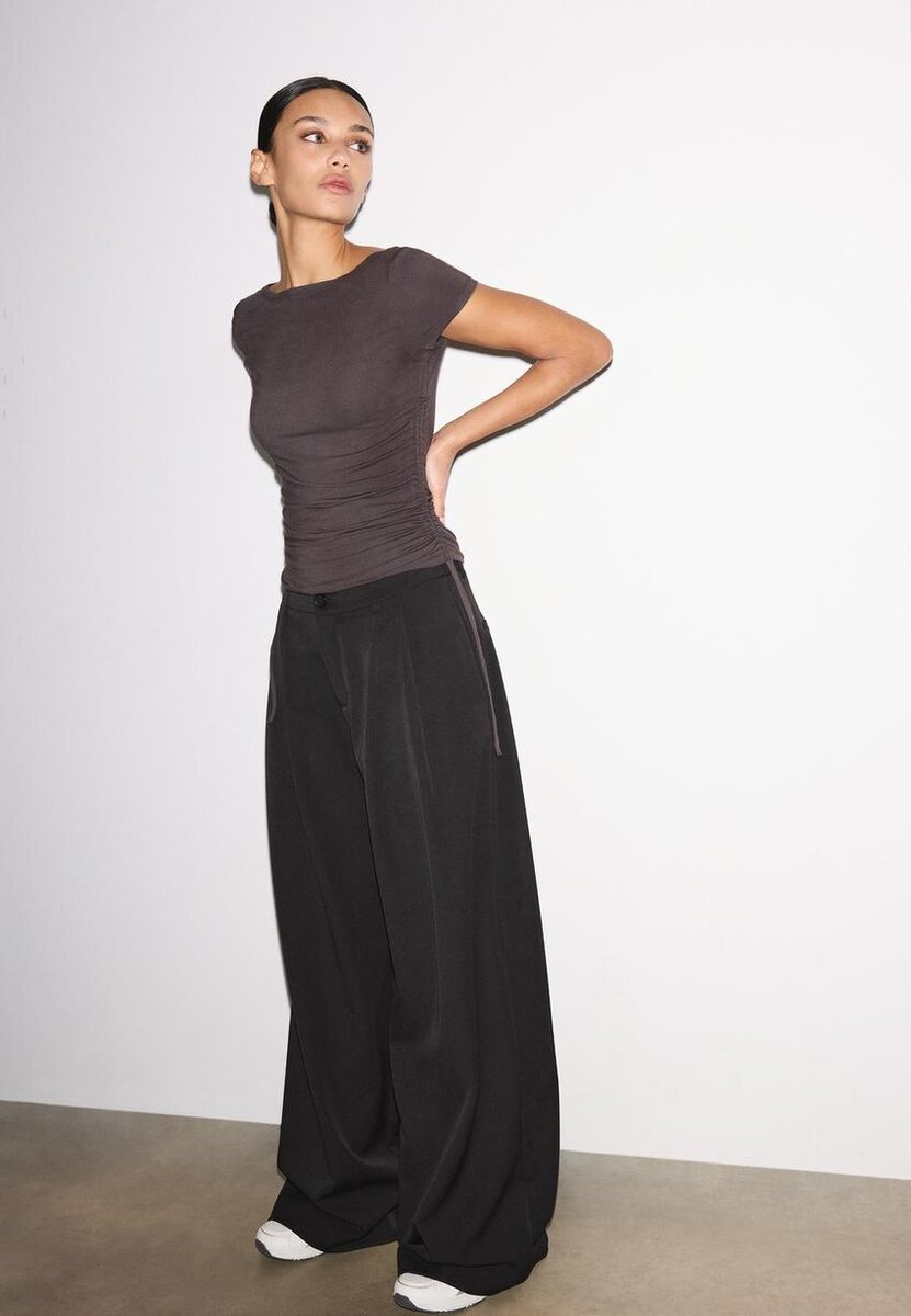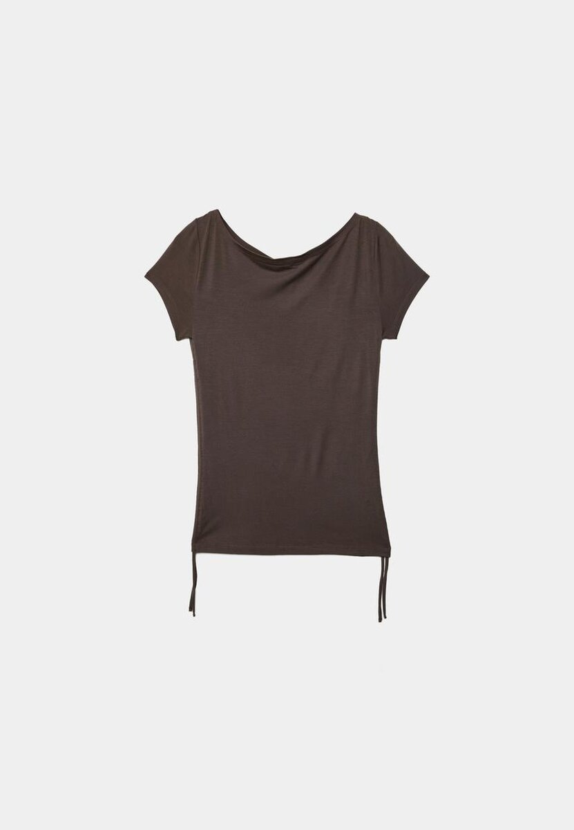 T-shirt aderente con scollo a barchetta. Maniche corte. Dettaglio arricciato regolabile sul lato. Disponibile in vari colori.
