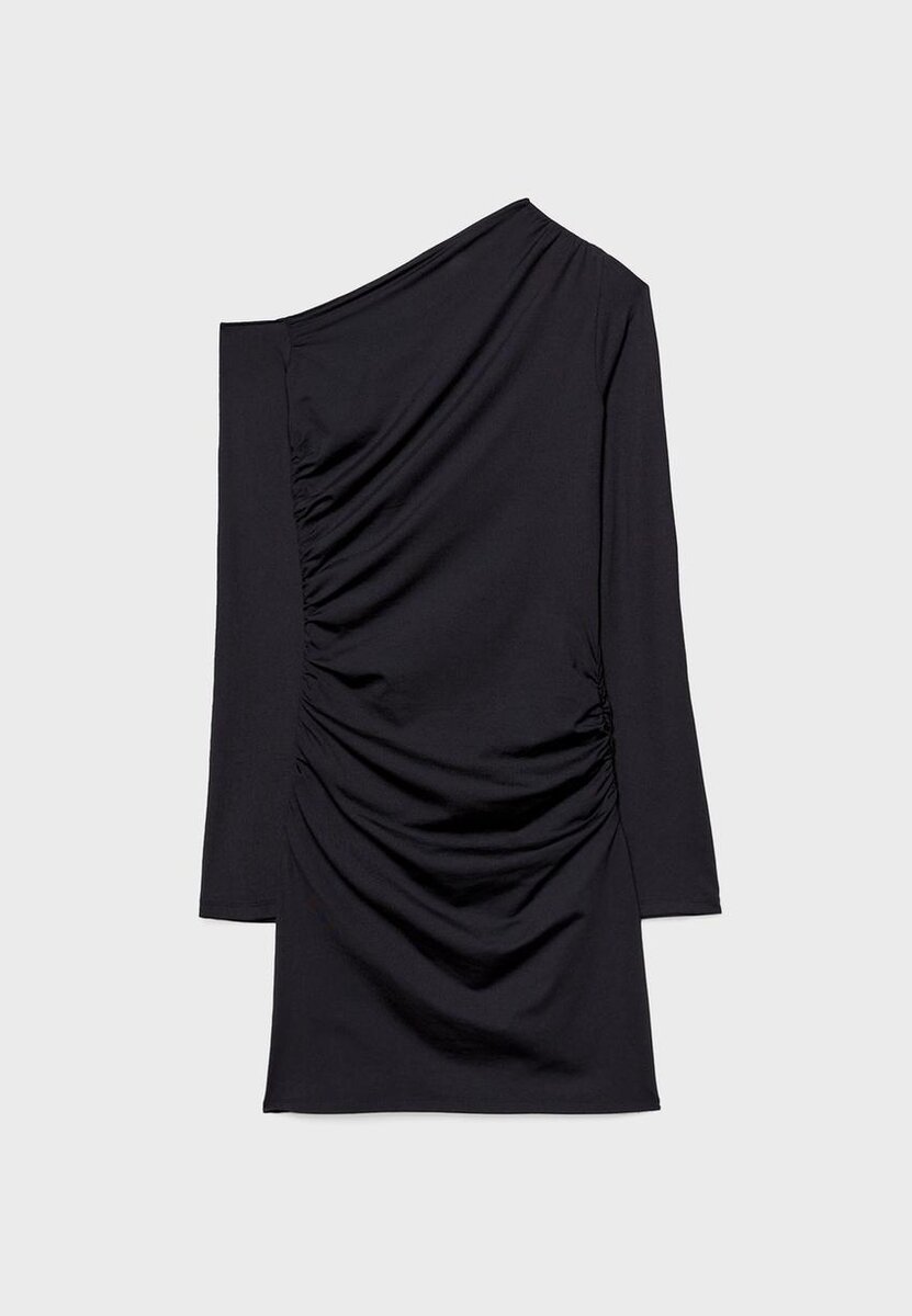 Vestito corto aderente con scollo asimmetrico, maniche lunghe con spalle scoperte e dettaglio di tessuto arricciato sul lato.