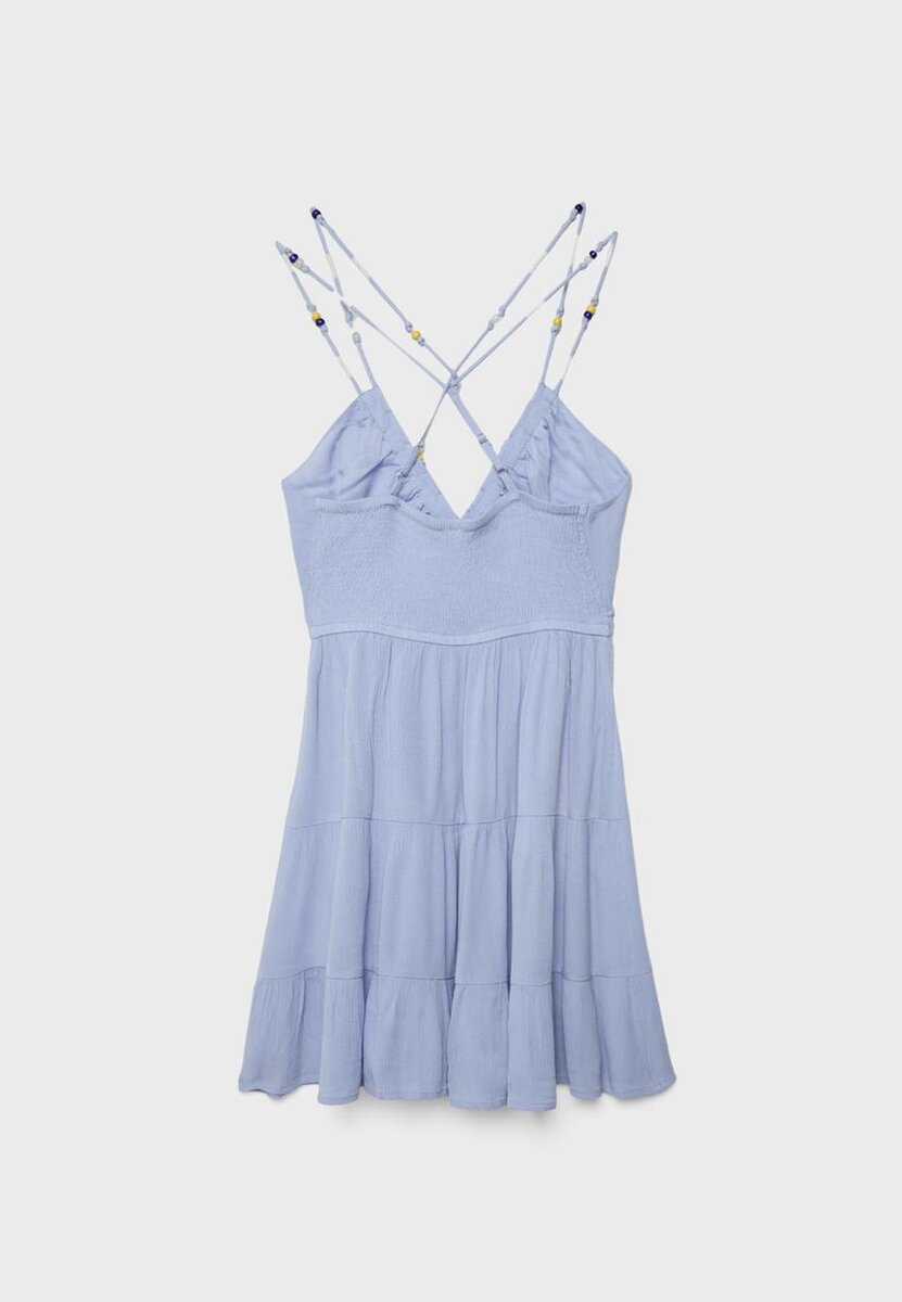 Abito corto in tessuto di viscosa. Caratterizzato da scollo a V e spalline sottili. Schiena scoperta con spalline incrociate. Silhouette flared. Dettagli con applicazioni di perline sullo scollo e sulle spalline. Parte superiore arricciata. Orlo con volant. Fodera interna in tinta.
