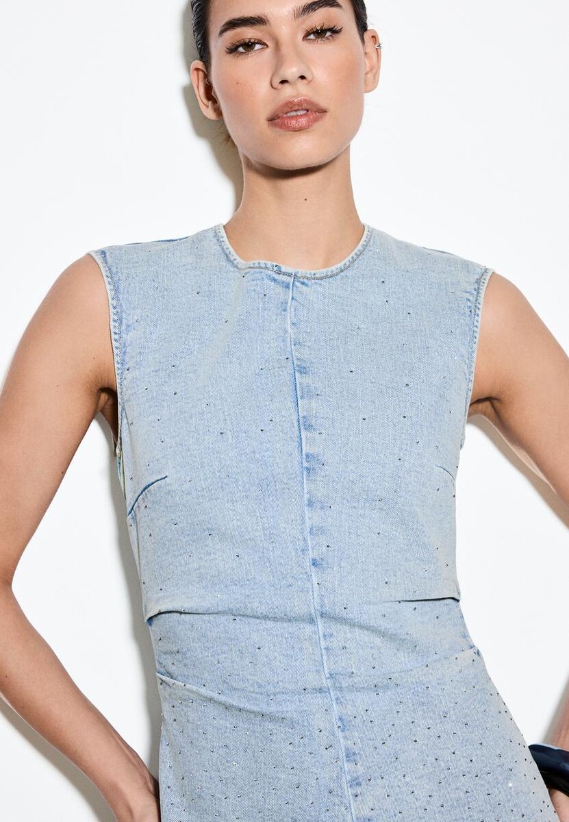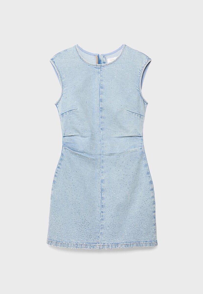 Abito corto in denim senza maniche con scollo rotondo. Caratterizzato da dettagli drappeggiati sui lati e chiusura con cerniera metallica sul retro, impreziosito da strass.