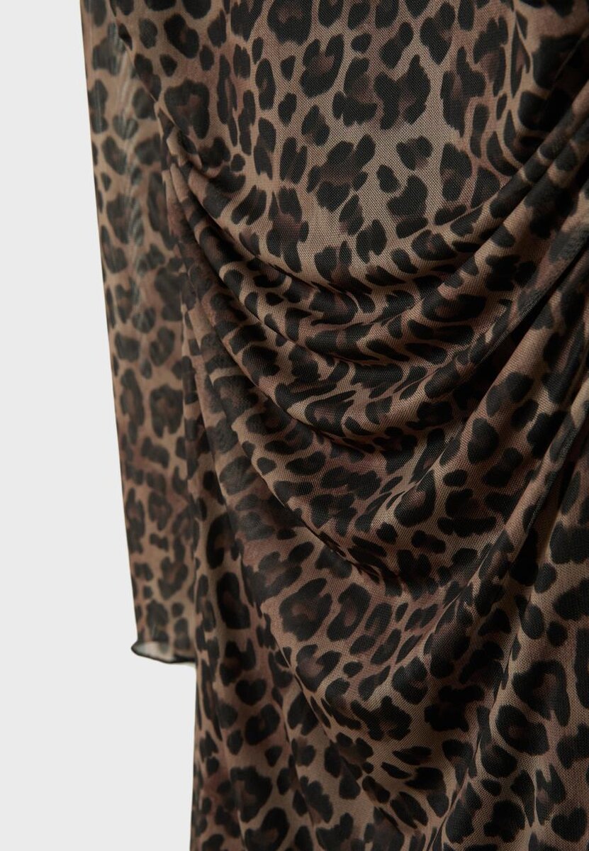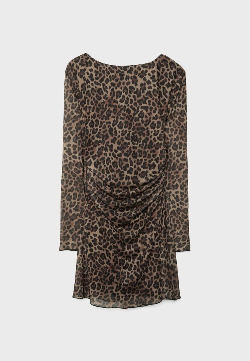 Vestito corto realizzato in tessuto di tulle stampato. Scollo a barchetta e maniche lunghe. Dettagli in tessuto arricciato sui lati. Fodera.