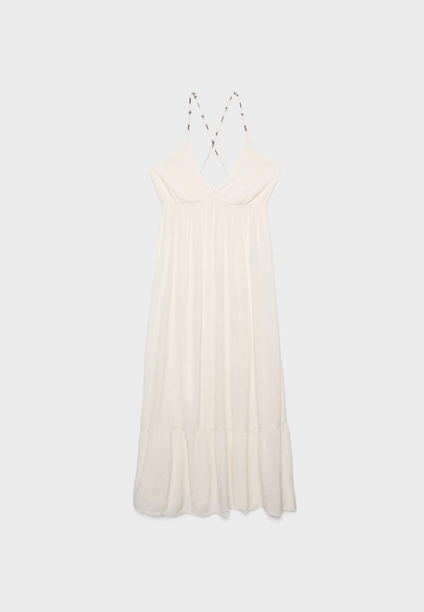 Abito lungo realizzato in tessuto di viscosa stropicciato. Caratterizzato da scollo a V e spalline sottili con dettagli in perline. Spalline incrociate sul retro, vita impero, arricciature sotto il busto e orlo con volant. Con fodera interna.