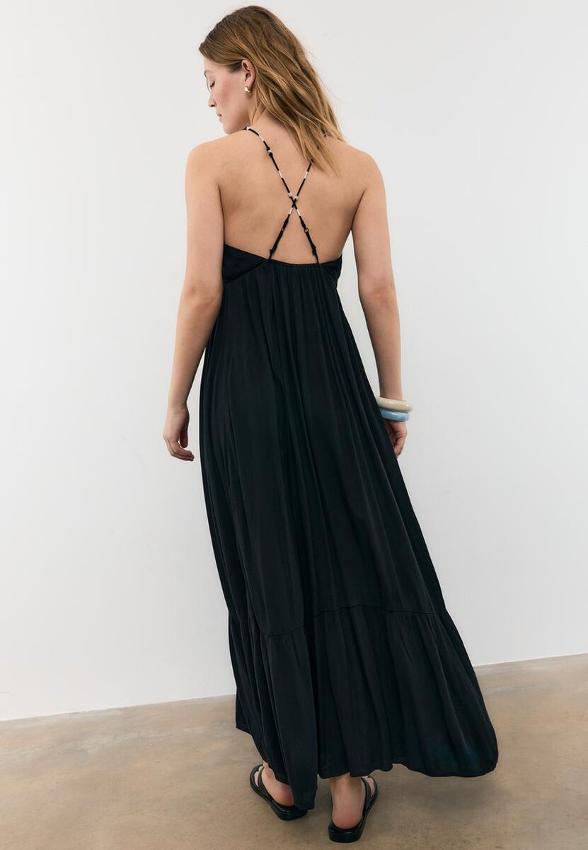 Vestito lungo realizzato in tessuto crêpe di viscosa. Caratterizzato da scollo a V, spalline sottili con dettagli in perline, incrocio sulla schiena, arricciatura sotto il seno, orlo con volant e fodera in tinta.
