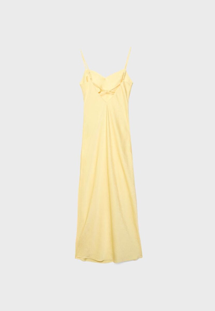 Vestito midi in raso con scollo a cuore e spalline sottili. Caratterizzato da un dettaglio incrociato sul retro. Disponibile in diversi colori.