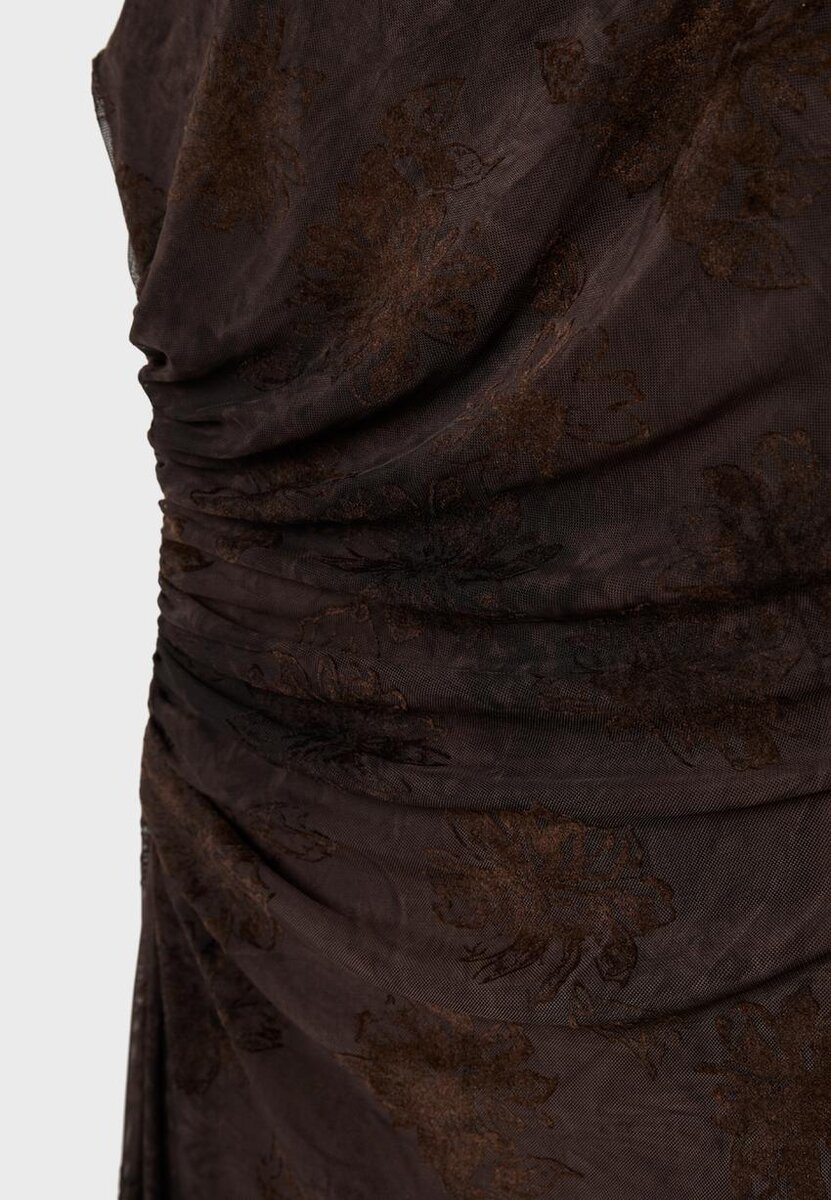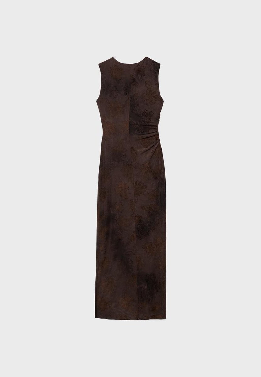 Vestito midi realizzato in tulle stampato. Scollo quadrato e senza maniche. Dettaglio di tessuto arricciato sul lato. Fodera interna abbinata.