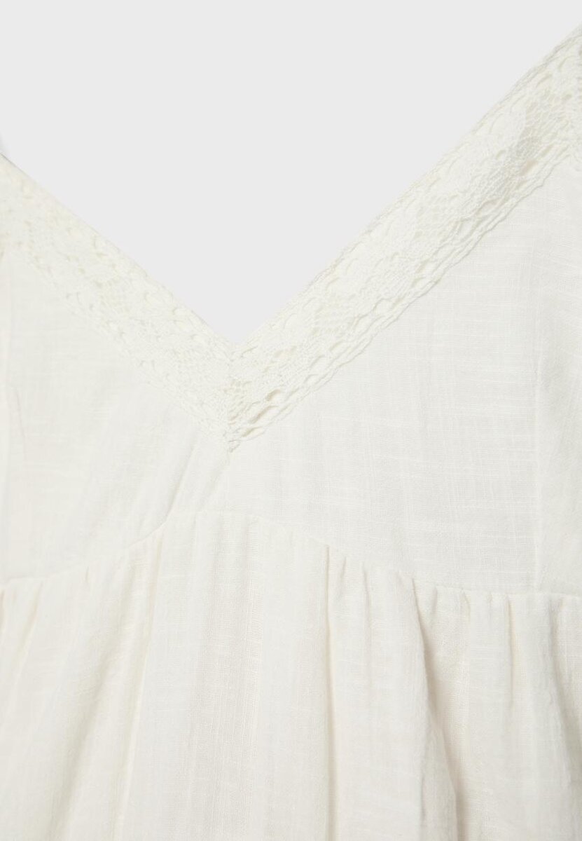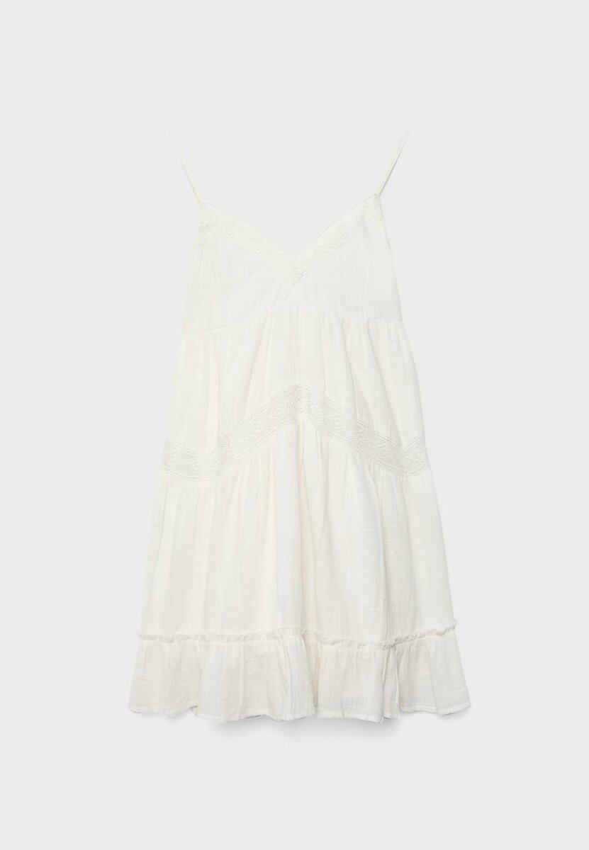Abito corto in tessuto di cotone. Scollo a V e spalline sottili. Silhouette a pannelli con dettagli in pizzo inserito. Orlo arricciato. Fodera interna.