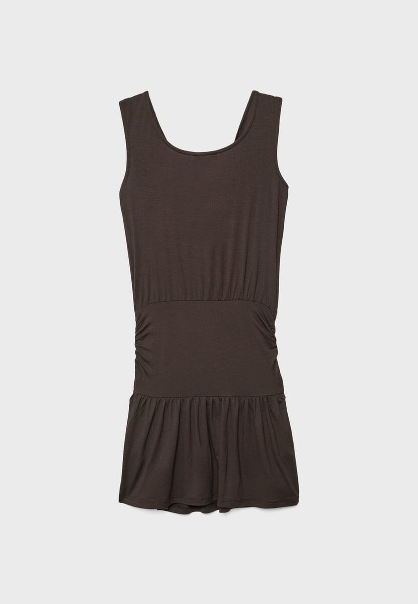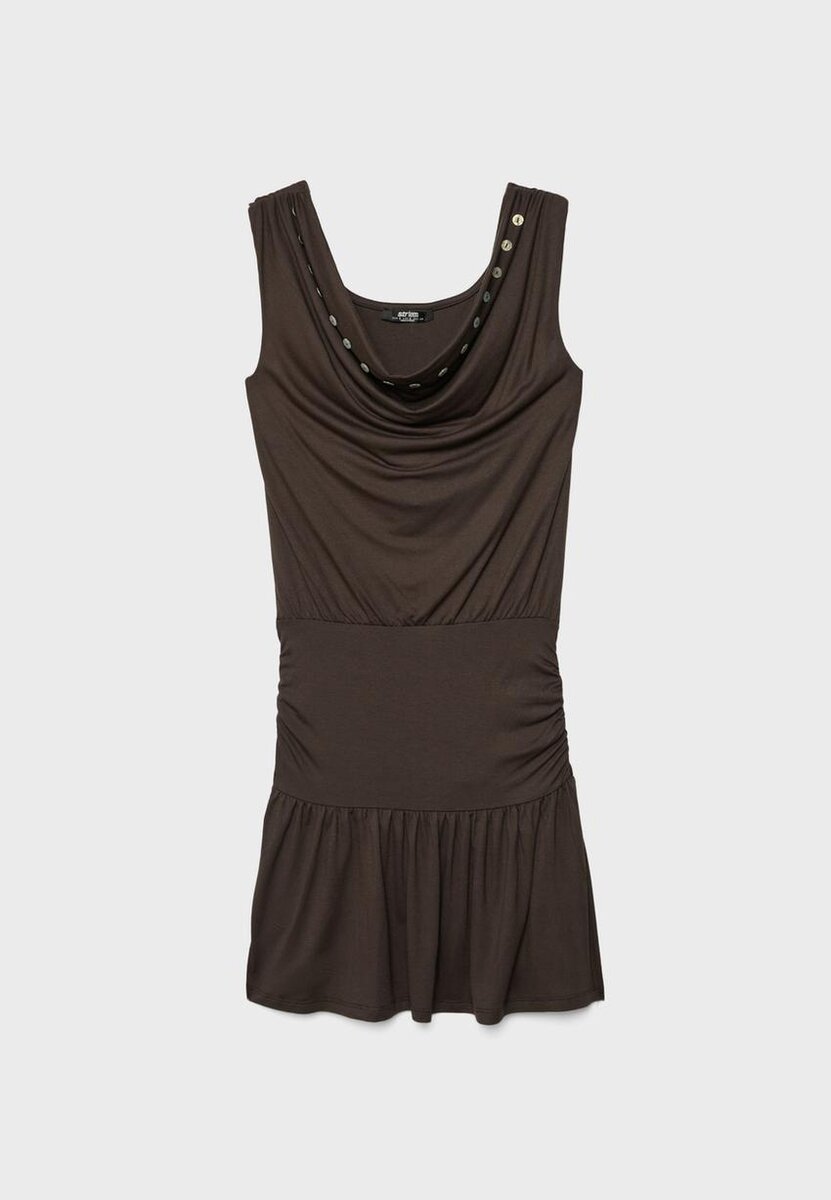 Vestito multiuso con scollo rotondo e design senza maniche. Caratterizzato da una fascia aderente, tessuto arricciato e bottoni.