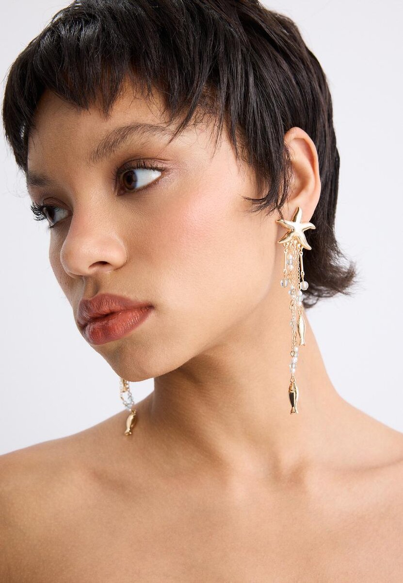 Orecchini a perno lunghi con dettaglio a forma di stella e design a cascata di catene con perline e motivi a forma di pesce.
