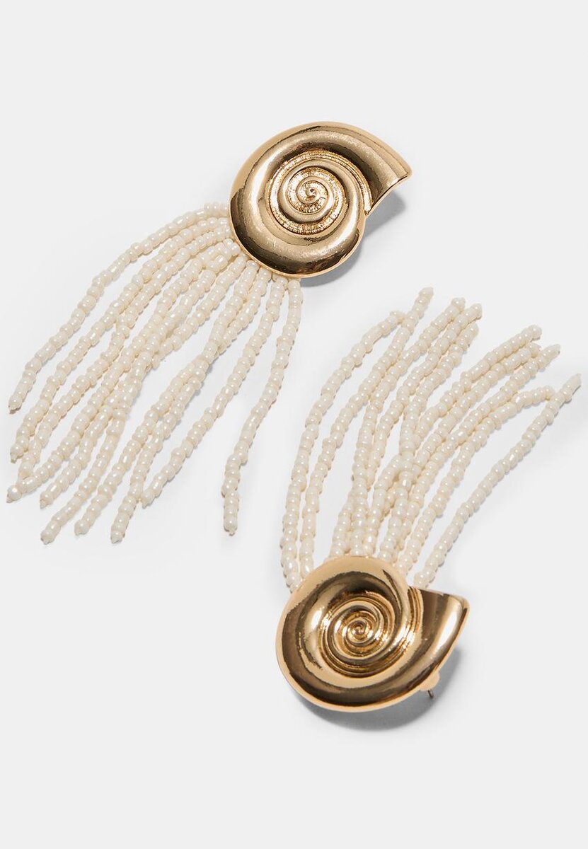 Orecchini pendenti. Caratterizzati da un elemento superiore a forma di conchiglia e da una cascata di perline.