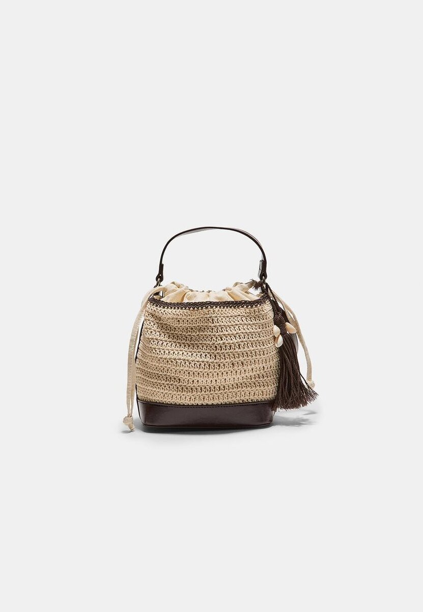 Borsa a secchiello con parte superiore all’uncinetto. Chiusura con cordoncino regolabile. Manico. Tracolla a bandoliera rimovibile e regolabile. Dettaglio con maxi nappa. Fodera in cotone. Disponibile in diversi colori.