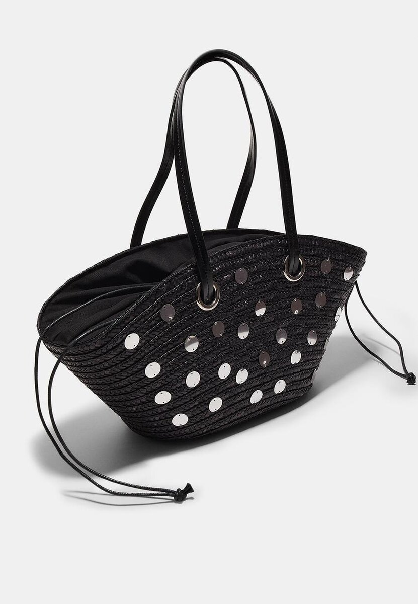 Borsa a cestino con decorazioni in paillettes. Dotata di doppia tracolla. Fodera in cotone. Chiusura con cordoncino. Disponibile in diversi colori.