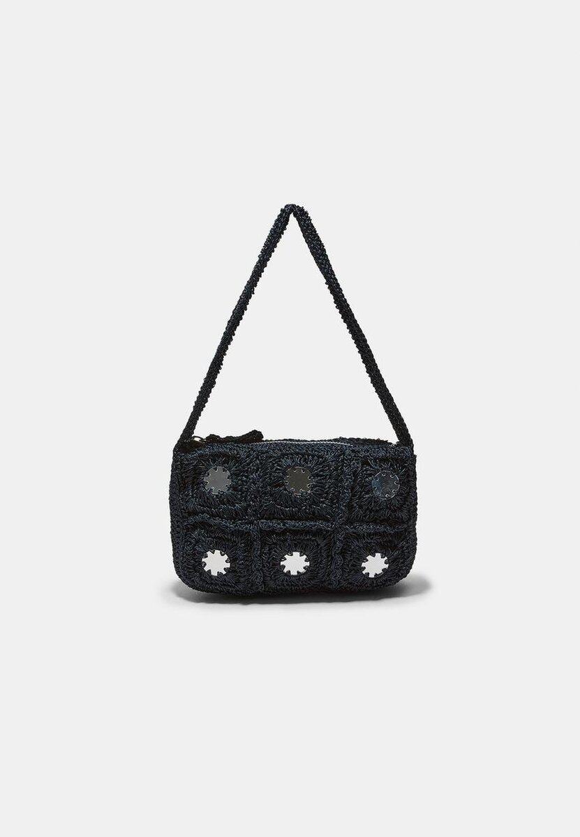 Borsa a tracolla all’uncinetto con dettagli a specchio sul davanti. Chiusura con cerniera. Disponibile in diversi colori.
