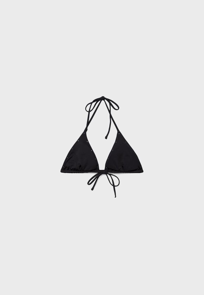 Top bikini a triangolo regolabile con chiusura a lacci sul collo e sulla schiena. Caratterizzato da dettagli con borchie. Disponibile in diversi colori.