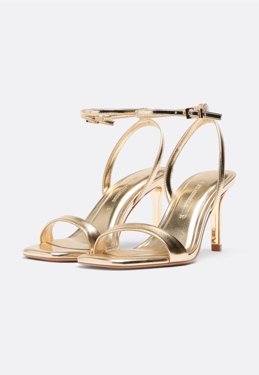 Scarpe col tacco a spillo. Cinturino medio sul collo del piede. Cinturino alla caviglia regolabile con fibbia. Rifinite con punta quadrata. Disponibili in oro e nero. Altezza tacco: 8 cm