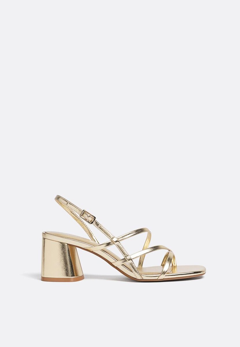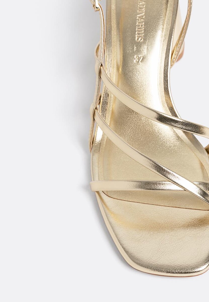 Sandali con tacco largo. Cinturini sul collo del piede. Chiusura con fibbia. Disponibili in oro. Altezza tacco 5,5 cm.