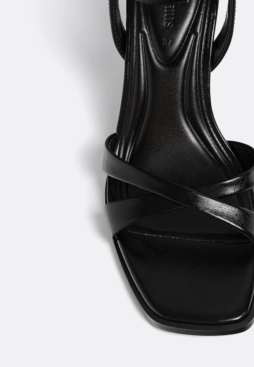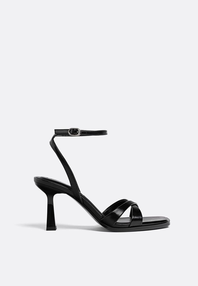 Sandali con tacco alto. Cinturini incrociati sul collo del piede. Chiusura con fibbia alla caviglia. Disponibili in nero. Altezza tacco: 8 cm.