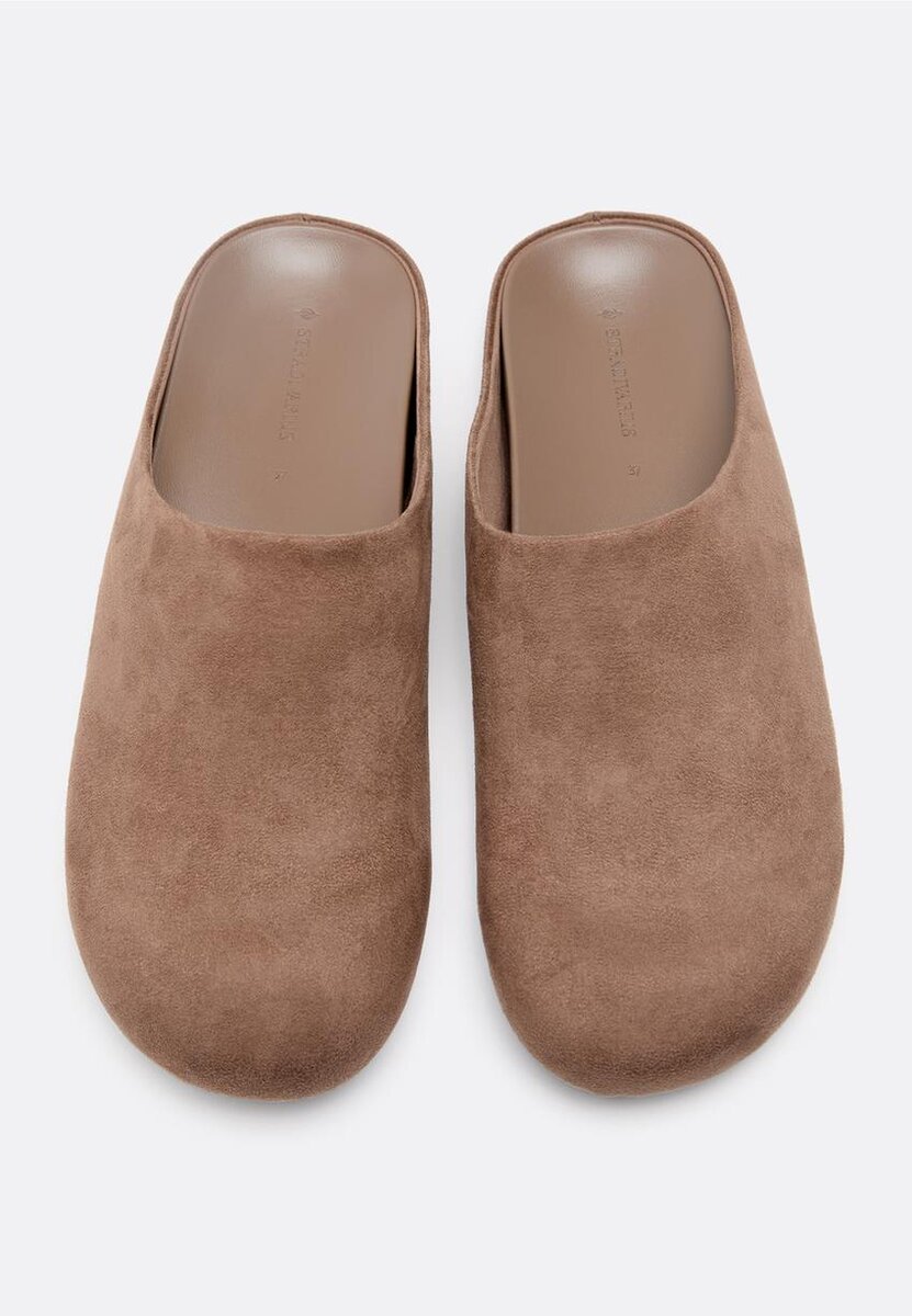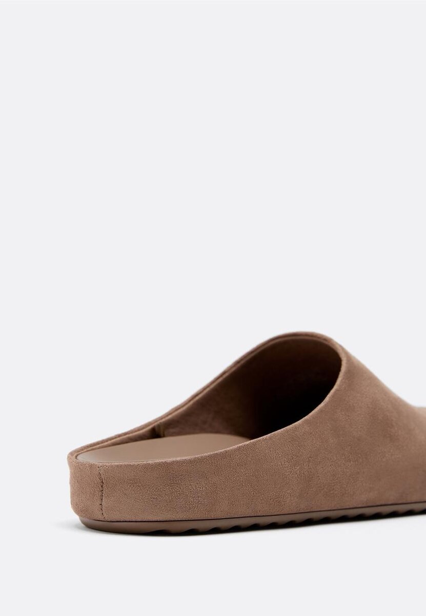 Zoccoli piatti in ecopelle scamosciata senza tallone e con punta arrotondata. Disponibili in marrone.