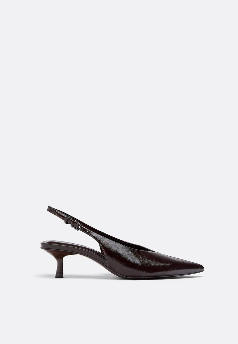 Scarpe col tacco basso effetto pelle. Punta affusolata. Scollo a V. Disponibili in nero, marrone ed ecru. Altezza tacco: 5 cm
