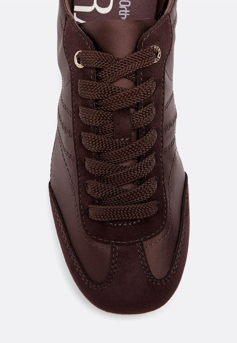 Sneakers con suola sottile in raso. Combinazione di materiali. Chiusura con lacci. Disponibili in bianco e marrone.