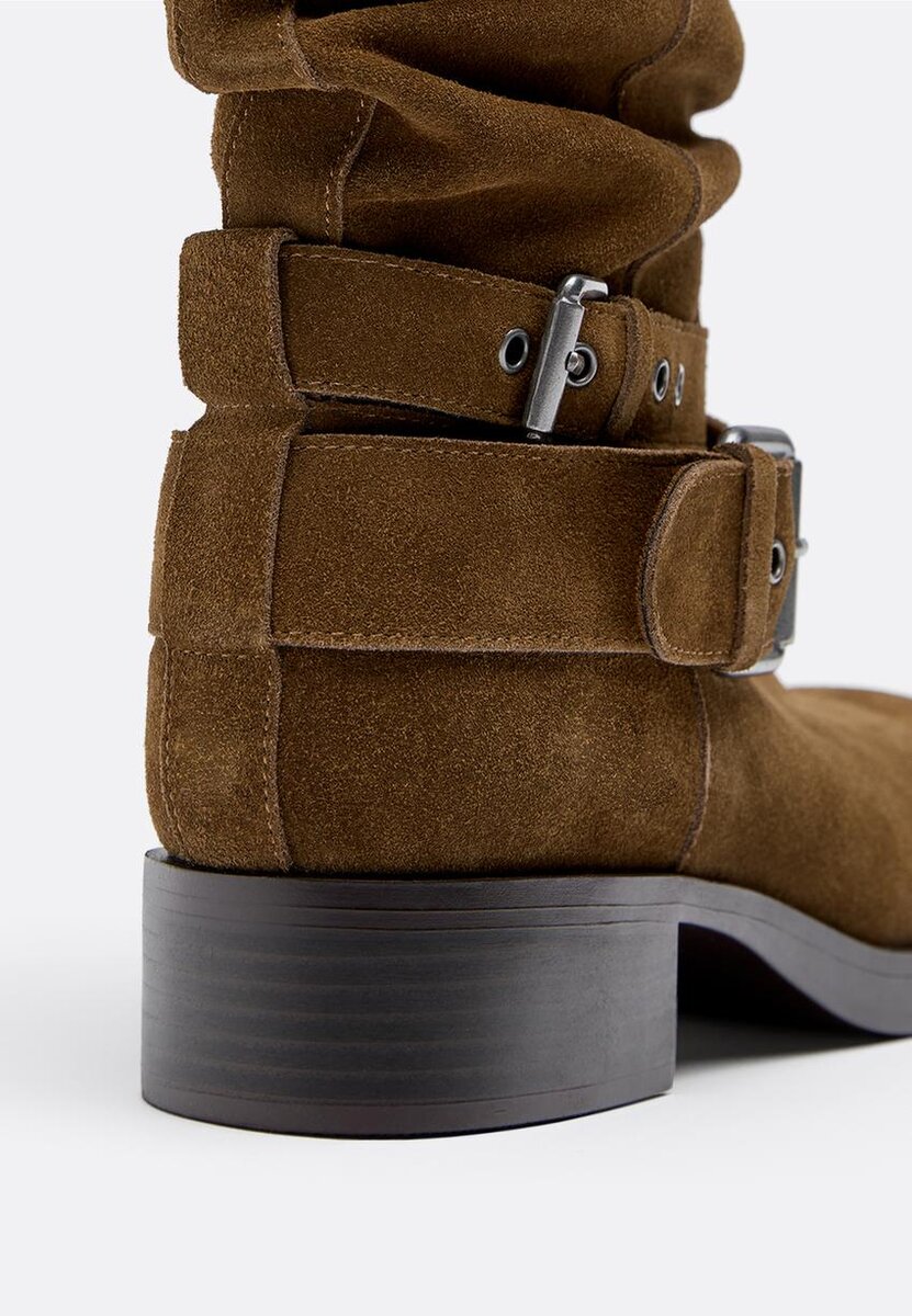 Stivaletti piatti in pelle con gambale Slouchy e dettaglio fibbia. Rifiniti con punta squadrata. Disponibili in marrone. Altezza suola: 4 cm.