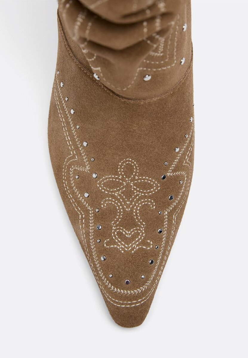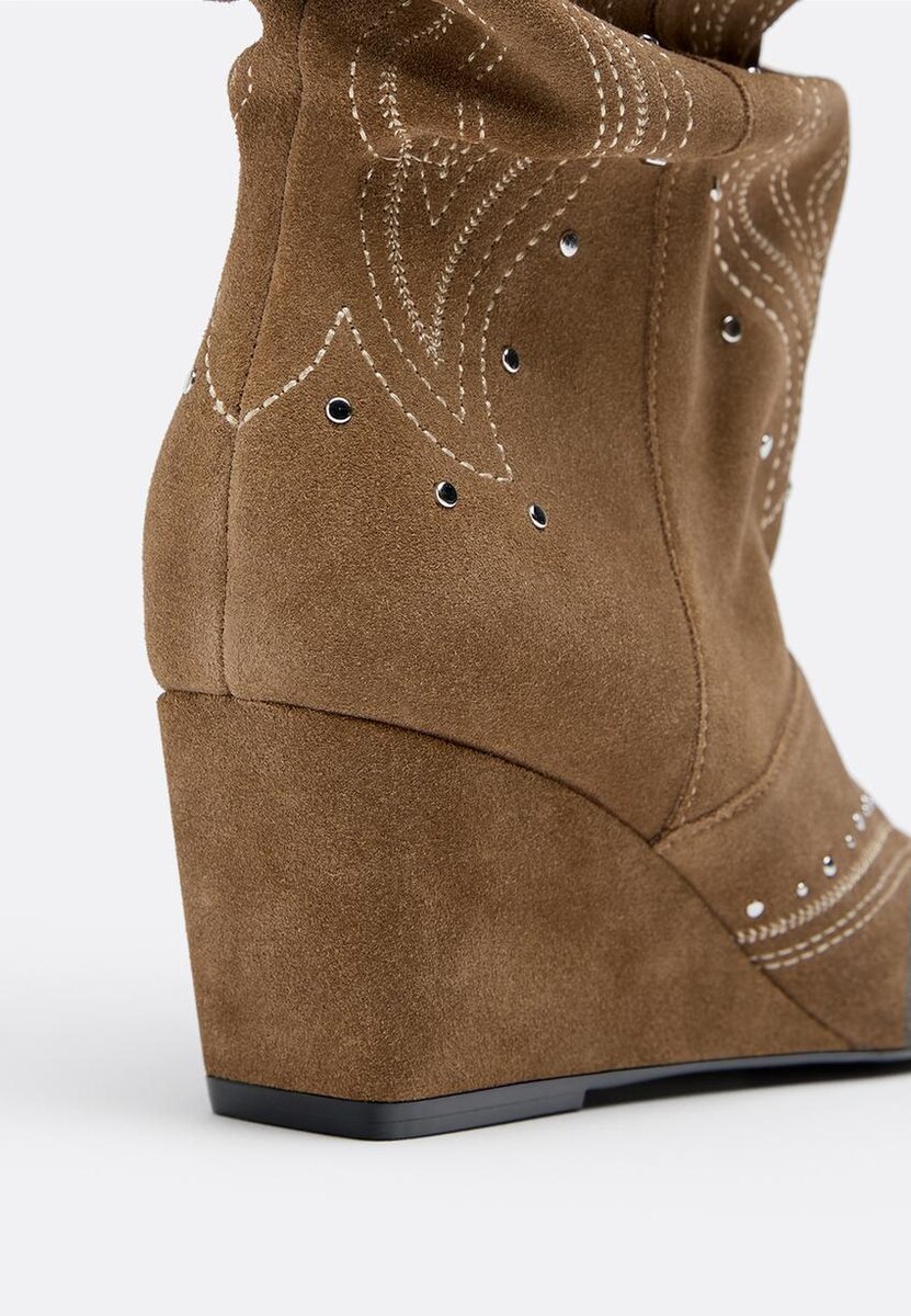 Stivali con tacco a zeppa in pelle. Gambale Slouchy. Dettagli con borchie e motivi ricamati intorno agli stivali. Rifiniti con punta affusolata. Disponibili in beige. Altezza tacco: 8 cm