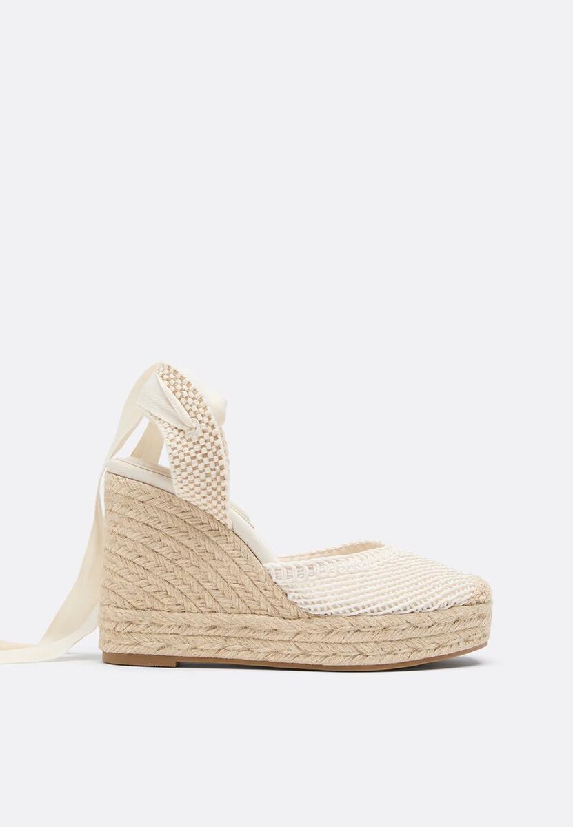 Zeppe in juta a maglia larga con plateau. Chiusura con lacci intorno alla gamba. Disponibili in beige e marrone. Altezza della zeppa: 12 cm.